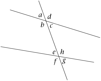 1. In the figure, \(a\) and \(e\) are both left of the transversal and above a line.