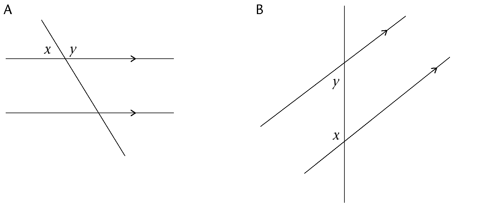 1. Without measuring, fill in all the angles in the following figures that are equal to \(x\) and \(y\).