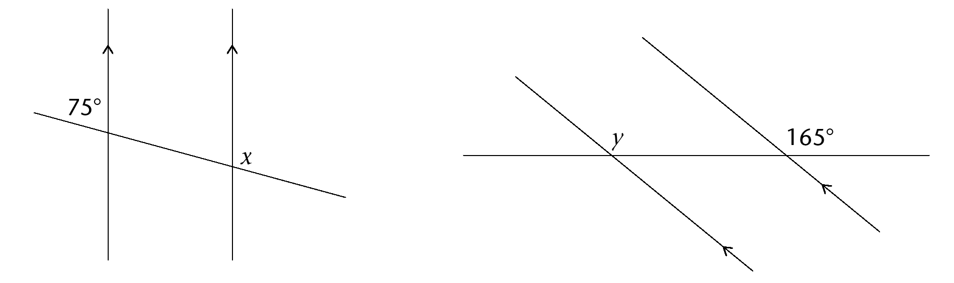 \( \begin{align} x &= \text{______}^{\circ} &&[\text{vert. opp.}\angle\text{s}] \\ \\ y + 105^{\circ} &= \text{______}^{\circ} &&[\angle\text{s on a straight line}] \\ y &= \text{______} - 105^{\circ} && \\ & = \text{______} \\ \\ z &= \text{______} &&[\text{vert. opp.}\angle\text{s}] \end{align}\)