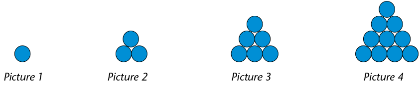 So far, we have determined the number of circles in the pattern by adding consecutive natural numbers. If we were asked to determine the number of circles in picture 200, for example, it would take us a very long time to do so. We need to find a quicker method of finding any triangular number in the sequence.