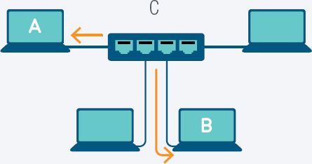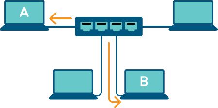 - Switches: The main purpose of switches is to share information between specific computers without involving the other computers in the network. This means that these computers can continue doing what they are doing. Looking at the following diagram, you will see that by using a switch, Computer A sends a message to Computer B, without the other computers seeing the message. Those computers can send other messages at the same time and without interference.
