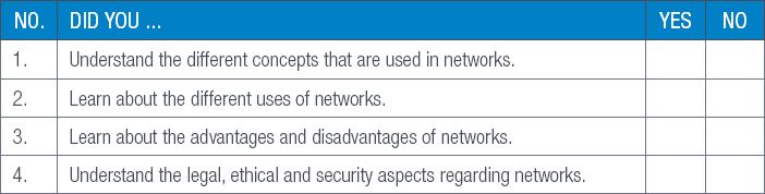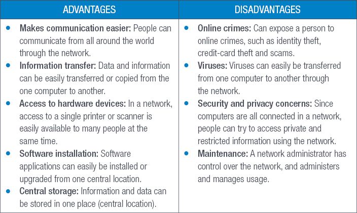 Everything has its advantages and disadvantages; it is just the way life goes. However, the table on the previous page is just a list of potential advantages and disadvantages; the way in which you use the network is the only way you get affected, positively and negatively. For example, if you want to learn how to bake, speak a new language or even build your own treehouse, there are always free resources to teach you a new skill. But at the same time, the downside is that the internet also has a dark side. So, what you get from a network depends on what you are looking for and your ability to use it.