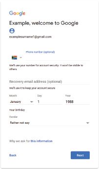 7.Pay careful attention to the items on the sign-up form that are optional. You can skip these items if you want to. For Google, submitting a phone number or recovery email address allows Google to help you recover your password if you forget it.