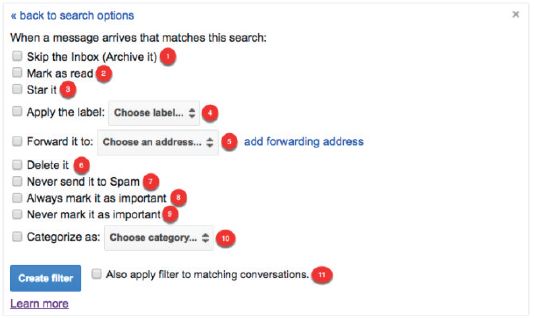 11. Also apply filter to matching conversations: Automatically applies the selected conditions to every email in your account that matches the selected filter criteria.