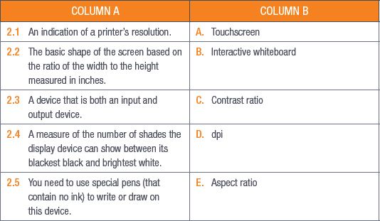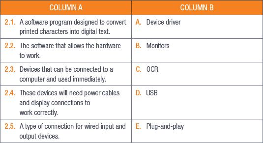5.2List two output devices that Thomas’s learners can use for their class projects. Also mention what equipment Thomas would need to connect each of these devices to a computer. (4)
