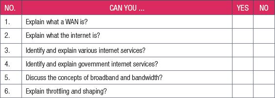 In this chapter, we will look at a wide-area network (WAN), as well as the best-known wide-area network, the internet. We will discuss how to obtain an internet connection and give some examples of internet services. Finally, we will explain broadband and bandwidth, and how they are affected by throttling and shaping.