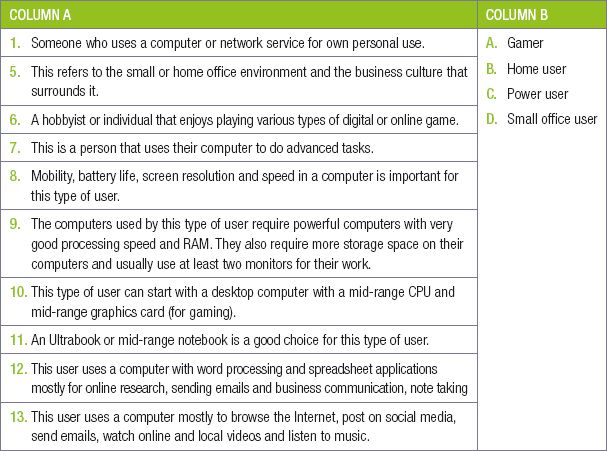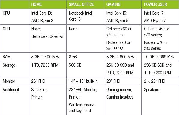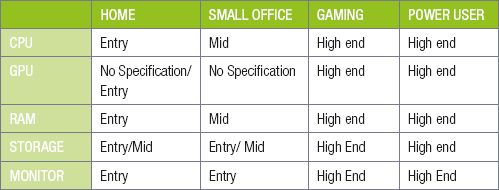 Read through the following table showing hardware configurations for different types of computers.