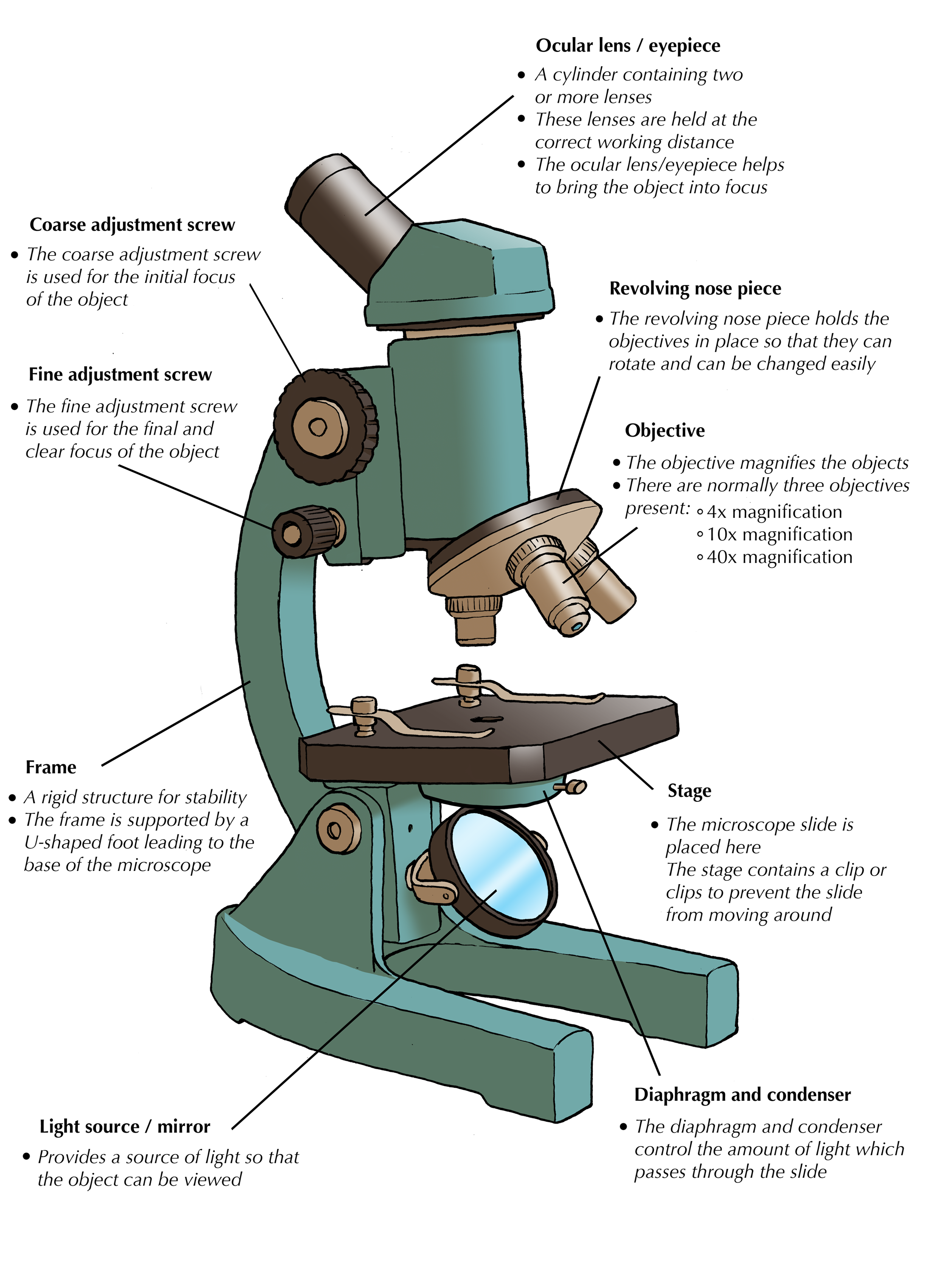 | Light source / mirror | - Provides a source of light so that the object can be viewed. |