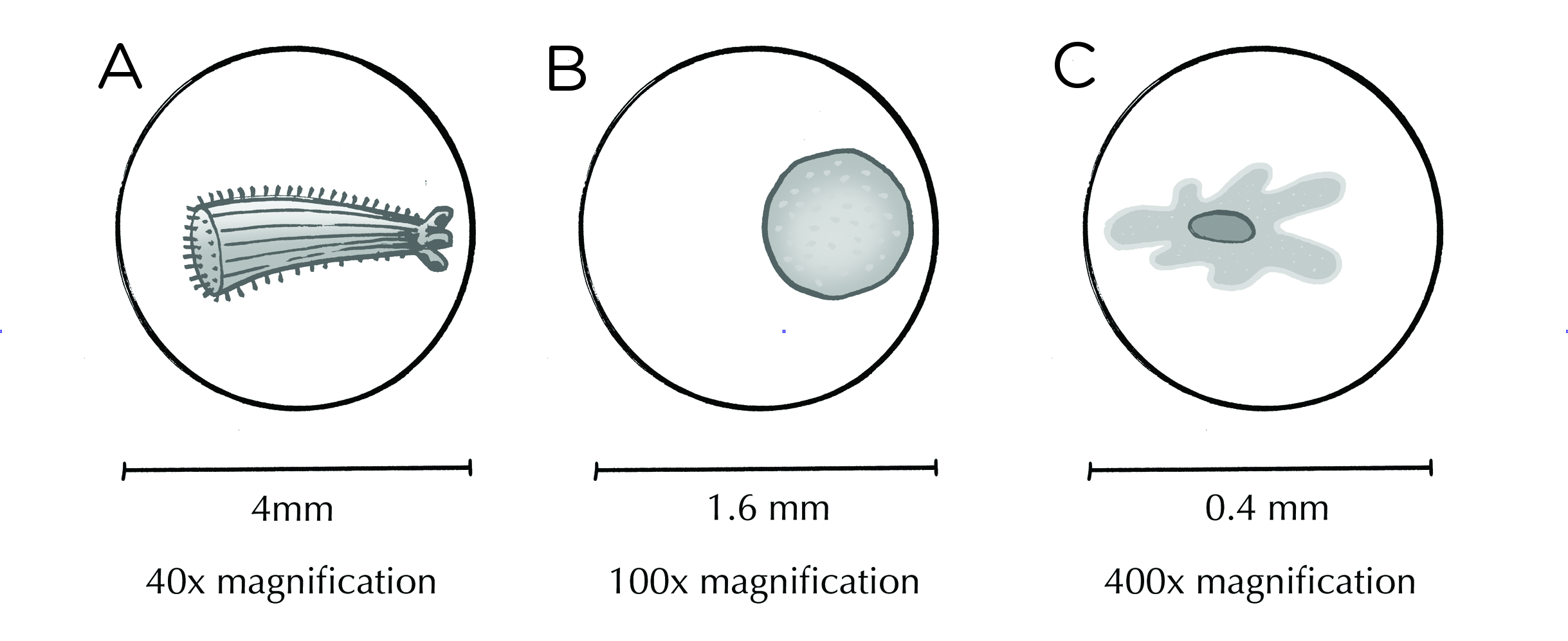 Examine the three images below. Use calculations Explain which organism would be the smallest when viewed with the naked eye. Show all the calculations you used to arrive at your answer.