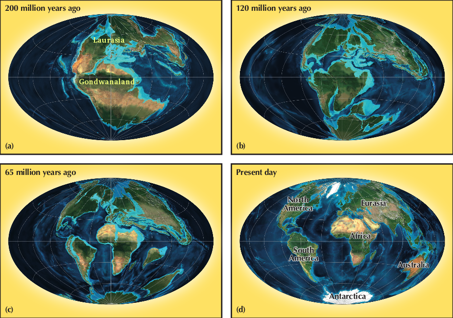 - Second phase: began in the early Cretaceous period (\(\text{150}\)–\(\text{140}\) million years ago) when Gondwana broke and separated into multiple continents: Africa, South America, India, Antarctica and Australia.