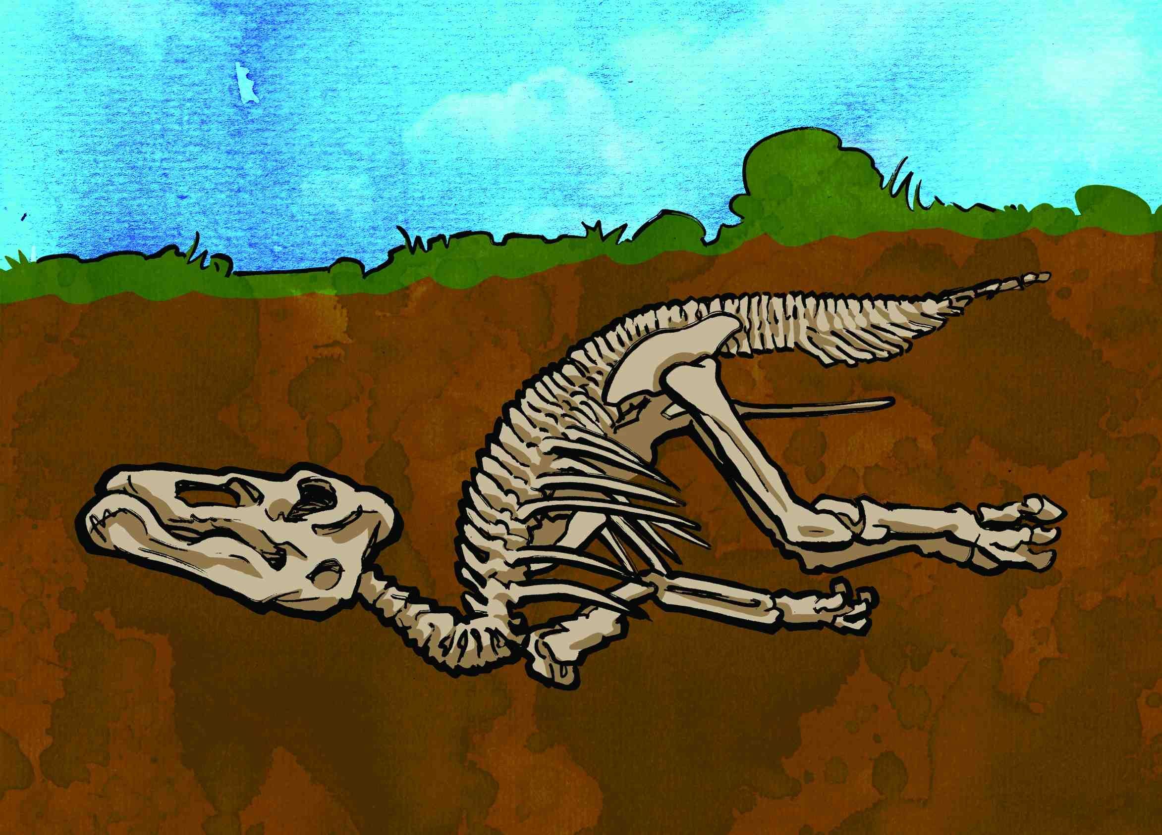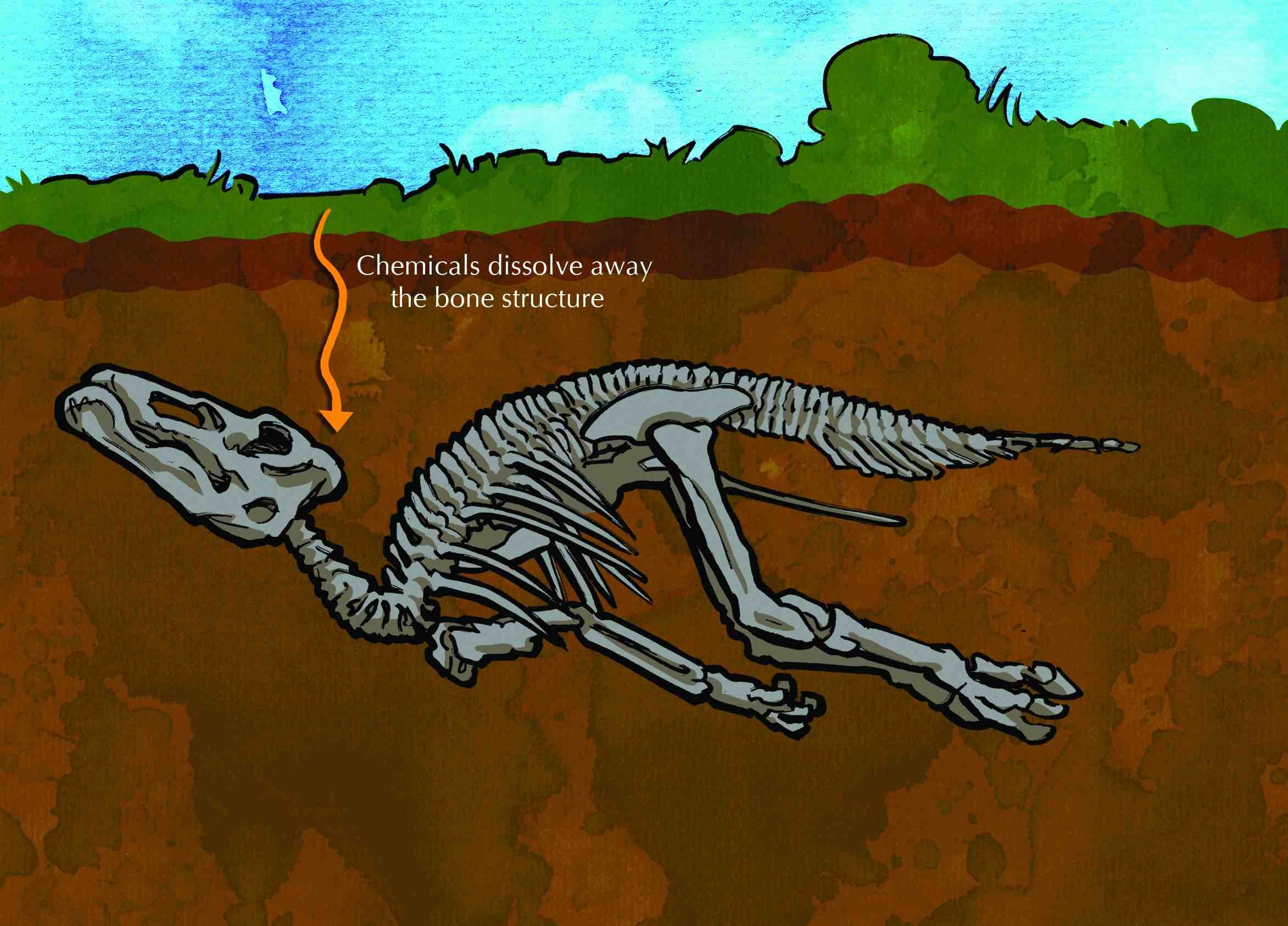 Eventually, this compression turns the sediment into rock, which forms a mould around the shape of the original skeleton. Sometimes the original bone or shell softens and dissolves completely, sometimes the bone or shell remains. Water that is rich in dissolved minerals trickles in through the layers of sediment into the mould.