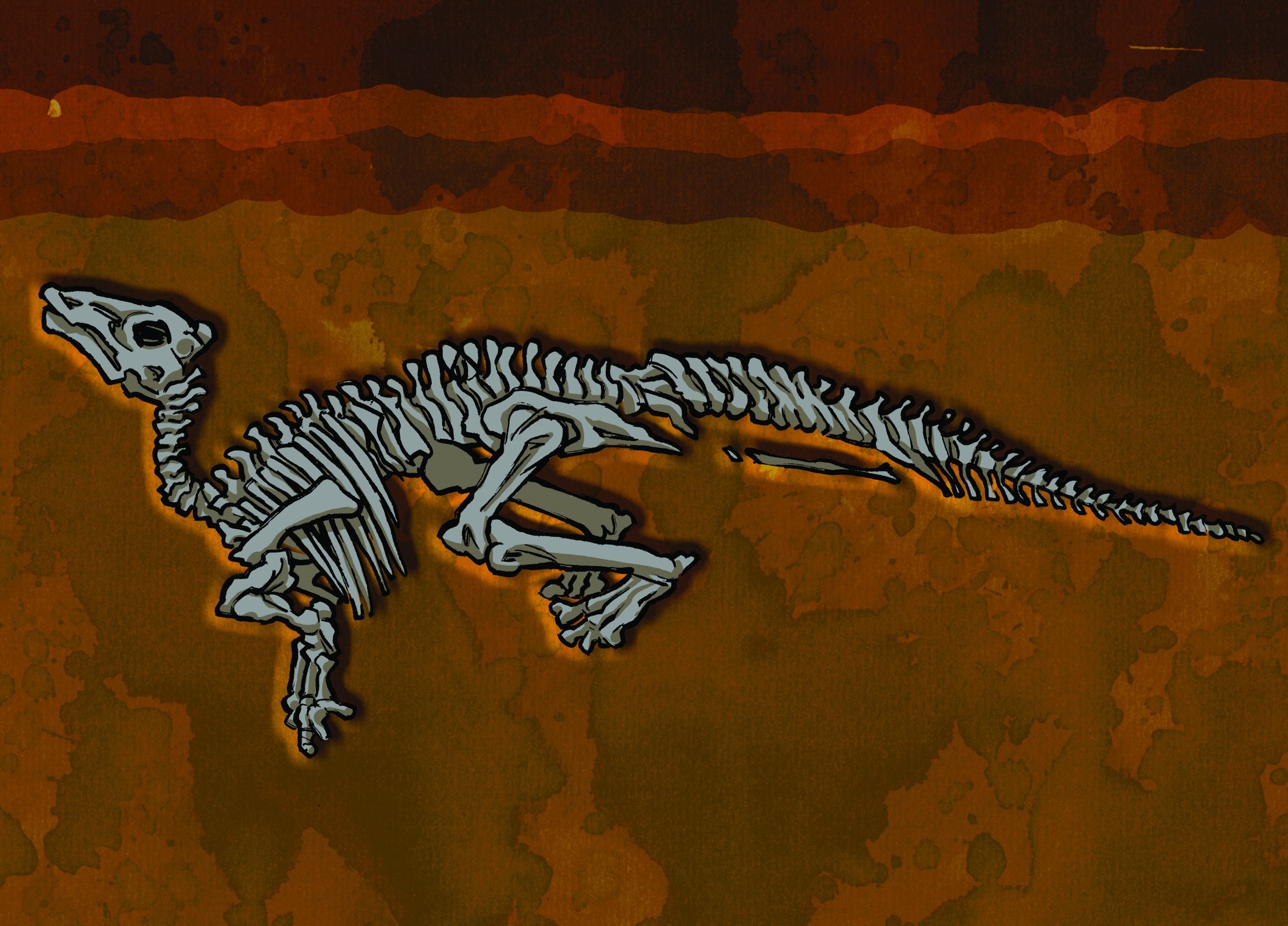Heavy rains gradually washed in enough sand and gravel to bury her bones. These deposits built up over thousands of years, burying her remains hundreds of metres deep. The calcium in her bones, molecule by molecule, was replaced by minerals from these deposits, turning the bones to stone.
