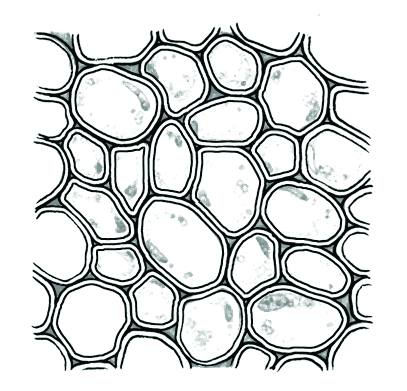 - Cover with a cover slip and observe under low power. You should focus on the groups of dark "stones" that appear amongst the rounded parenchyma cells of the pear. Try to find one or two stone cells or sclereids that are separate from the rest.