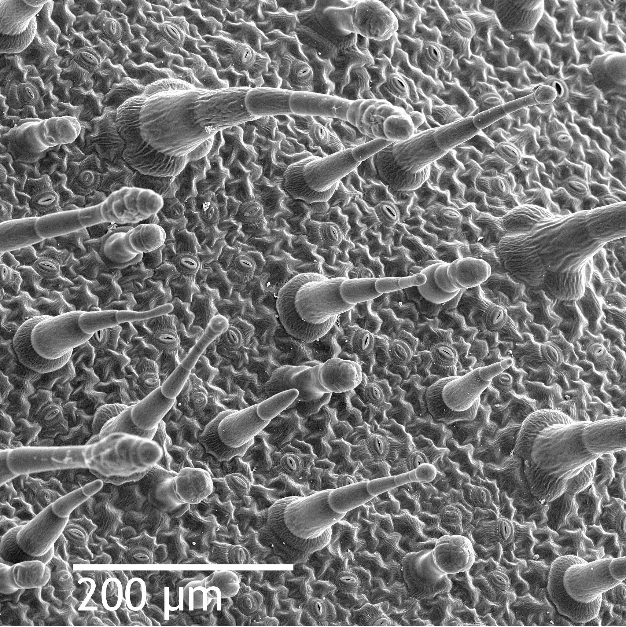Figure 4.6: Scanning electron microscope image of Nicotiana alata (tobacco plant) upper leaf surface, showing trichomes (also known as `hairs') and a few stomata.