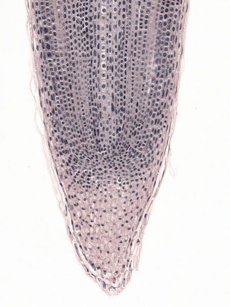 Meristematic tissue is found in root tips as this is where roots are growing and where dividing cells are produced. Figure 4.5 shows a micrograph image of a root tip.