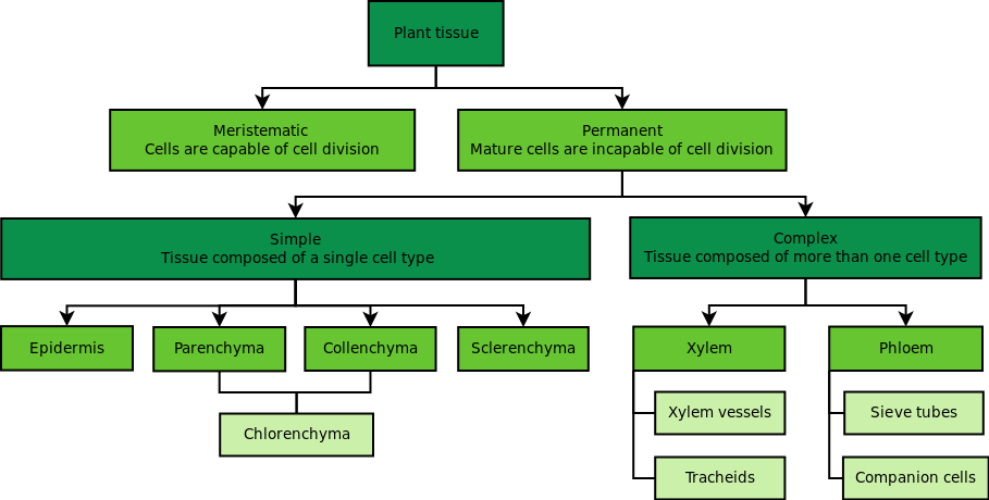 Plants are typically made up of roots, stems and leaves. Plant tissues can be broadly categorised into dividing, meristematic tissue or non-dividing, permanent tissue. Permanent tissue is made up of simple and complex tissues.