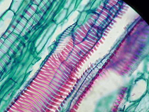 - Examine under low power, focusing on the bundles of xylem vessels. Look for long bundles of fairly wide cells with thickening in the form of rings or spirals. Do not confuse xylem vessels with the more common and much narrower sclerenchyma fibres - fibres have walls all the same thickness, have no spirals or rings and they are pointed at the end. If necessary, make a second slide if you did not find xylem.