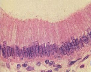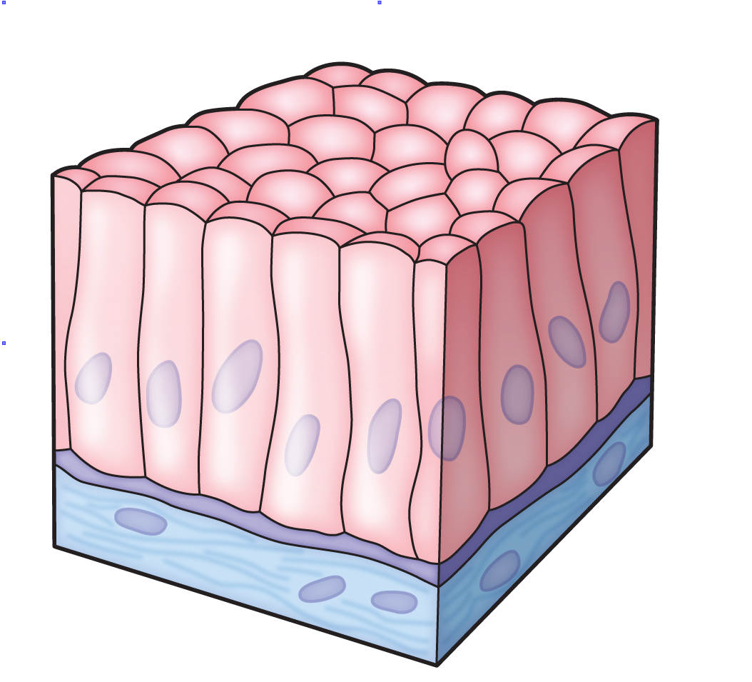 | Columnar | Digestive tract, reproductive organs | Elongated cells, nuclei located at the base of the cell. Cells connected by tight junctions and receive their nutrients from the basement membrane. | Main function is protective. Prevents against bacterial infection. Can also secrete mucus to protect surface from damage. |