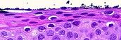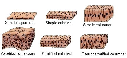 There are different types of epithelial tissue which are named according to the number of layers they form and the shape of the individual cells that make up those layers. Simple epithelium refers to a single layer of cells. Stratified epithelium refers to two or more layers of cells. Squamous epithelium refers to flattened cells, cuboidal epithelium refers to cells that are cube-shaped and columnar epithelium refers to vertically elongated cells. Ciliated epithelium refers to epithelial cells that contain many tiny hair-like projections.