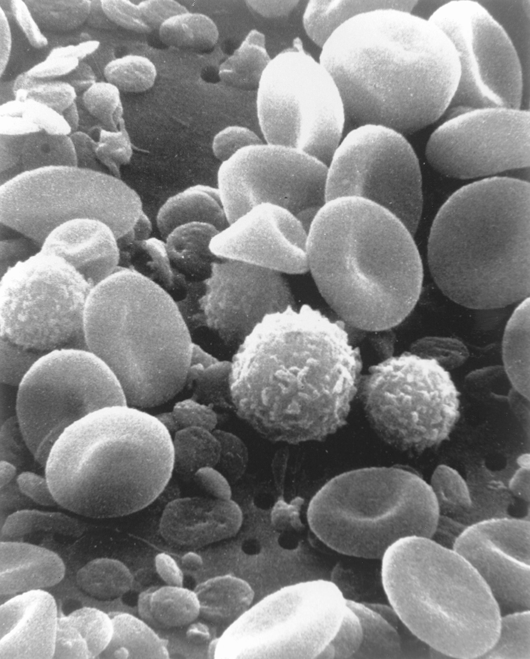 Figure 4.27: Scanning electron microscope image of circulating blood showing several red and white blood cells. |