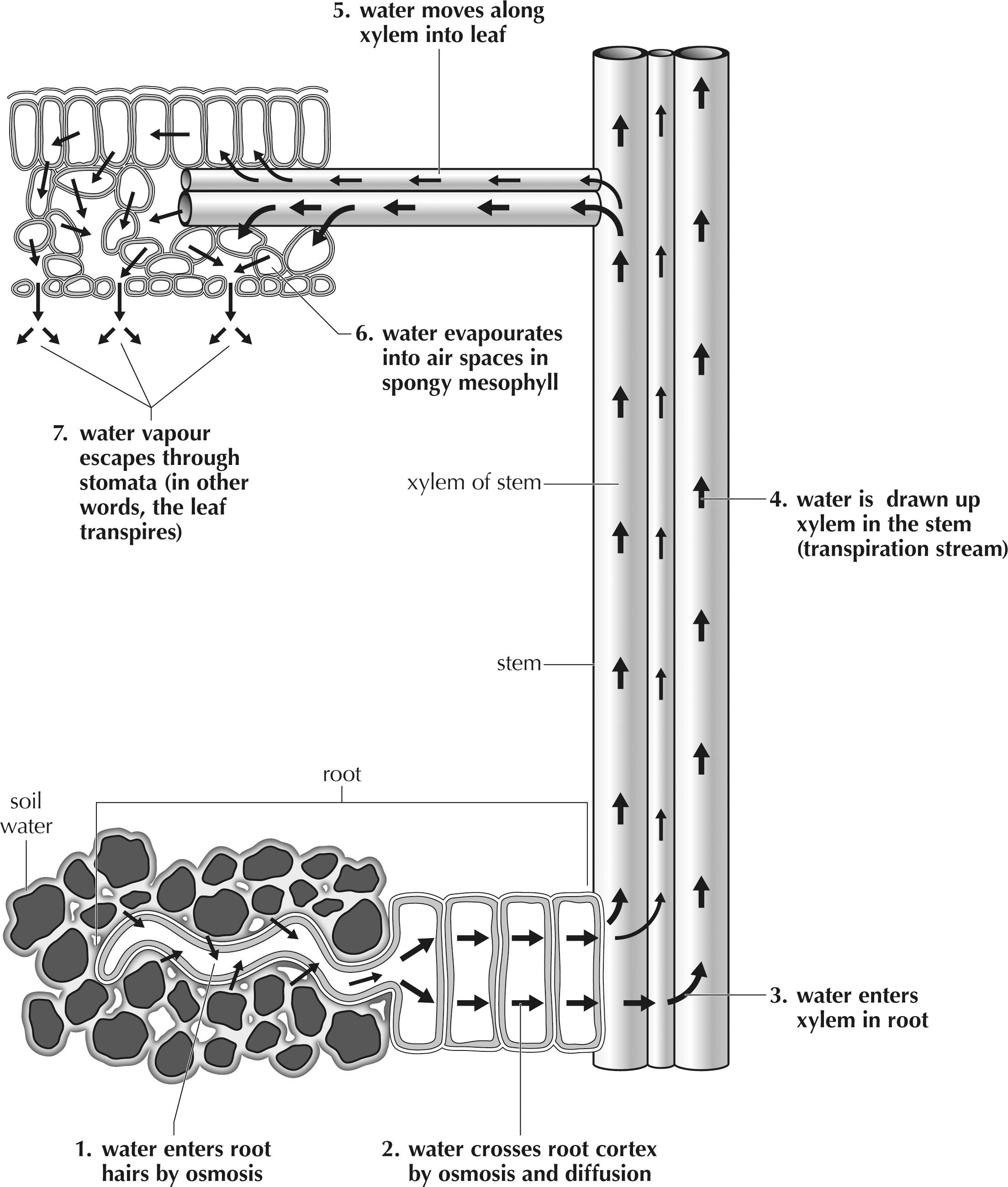 Figure 5.27: Step-by-step transport of water in plants, from the roots to the xylem.