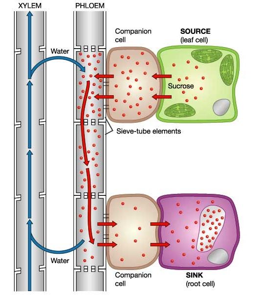 This section deals with how sugars are transported from the leaves to the rest of the plant via specialised phloem cells.