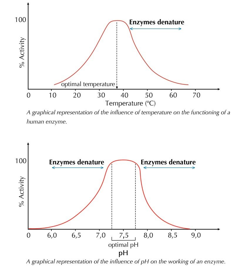 In humans, enzymes function best at \(\text{37}\)\(\text{°C}\) (Figure 1.20). This is the optimum temperature. At very high temperatures proteins denature; this means that the hydrogen, hydrophobic and electrostatic interactions that result in the protein's three-dimensional shape break down, unravelling the protein into its primary structure, a long chain of amino acids. When a protein is denatured, the shape of its active site, as well as the rest of the protein shape is altered. The substrate can no longer fit in the active site of the enzyme and chemical reactions cannot take place. Low temperatures can slow down or even inactivate enzymes, as low temperature means less available kinetic energy, so that even the lower energy of activation that the enzyme allows is not available. The first graph shows the effect of temperature on enzyme activity.