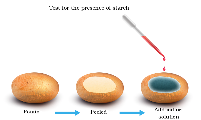 The potato or bread turns blue-black in the presence of iodine solution, but the lettuce leaf does not.