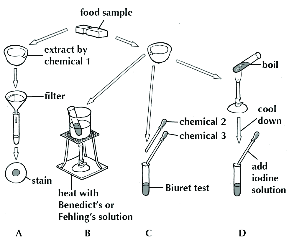 The diagram shows the apparatus used in various organic food tests. Study it and answer the questions that follow: