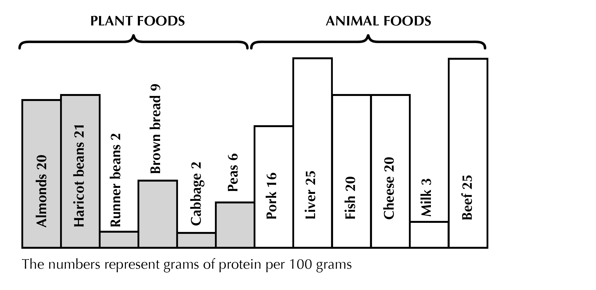 Study the graph below. The graph shows total protein (in grams) present in a 100 grams of different food items. Use the graph to answer questions below.