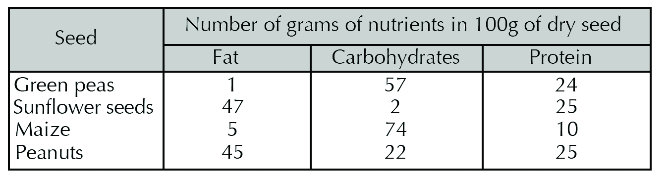 The table below gives nutrients present in various dry seeds.