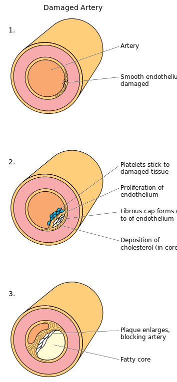 This is also referred to as a myocardial infarction. Heart muscles are provided with oxygenated blood by a system of coronary arteries. Blocked flow of blood can cause the death of cardiac muscle due to lack of oxygen. Arteries get blocked as a result of the gradual build-up of lipids and cholesterol, which form a plaque. This condition of plaque build up in the arteries is referred to as atherosclerosis. When a plaque bursts, it causes blood to clot at the site of the rupture and obstructs the artery (see diagram in figure:damagedarteryblocked). Often there are no symptoms of atherosclerosis. However, some people who have narrowed coronary arteries experience chest pain, (angina), when blood flow to the heart is insufficient.