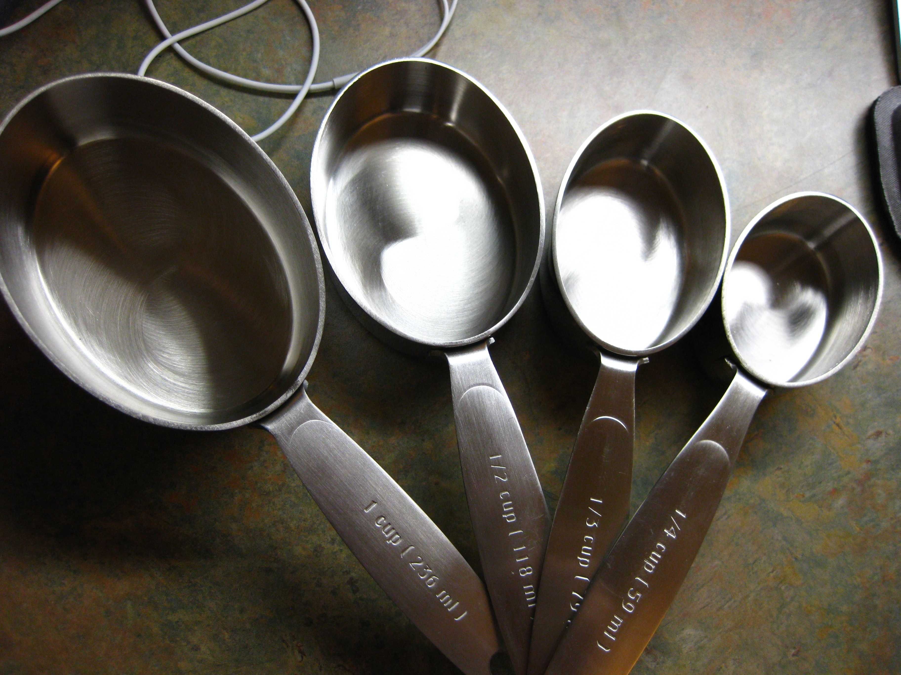 In recipes used for cooking and baking we often find the measurements for the ingredients required in cups, teaspoons and tablespoons. Measuring cups and spoons come in standard sizes, and are common in the kitchen and in recipes because they are quick and simple to use. It's very easy to measure out a quantity of baking powder in a measuring spoon, for example - much quicker than it would be weighing it on a scale.