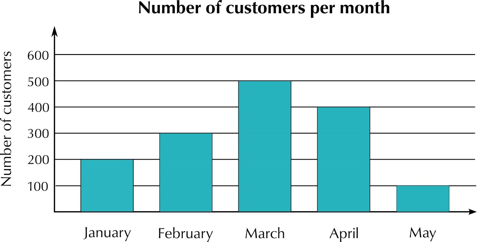 Bar graphs are used to display data that compared in categories. For example, every month for five months, a new store keeps count of how many customers visit the store. We can represent this on a bar graph as shown below: