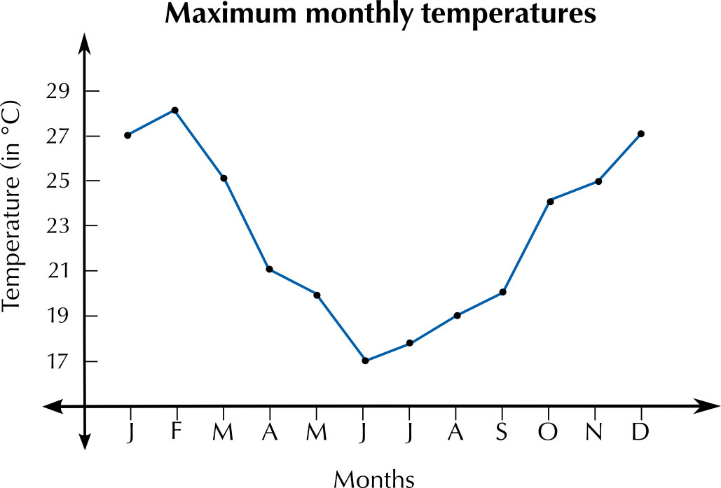 Max Temp (°C) | \(\text{27}\) | \(\text{28}\) | \(\text{25}\) | \(\text{21}\) | \(\text{20}\) | \(\text{17}\) | \(\text{18}\) | \(\text{19}\) | \(\text{20}\) | \(\text{24}\) | \(\text{25}\) | \(\text{27}\) |