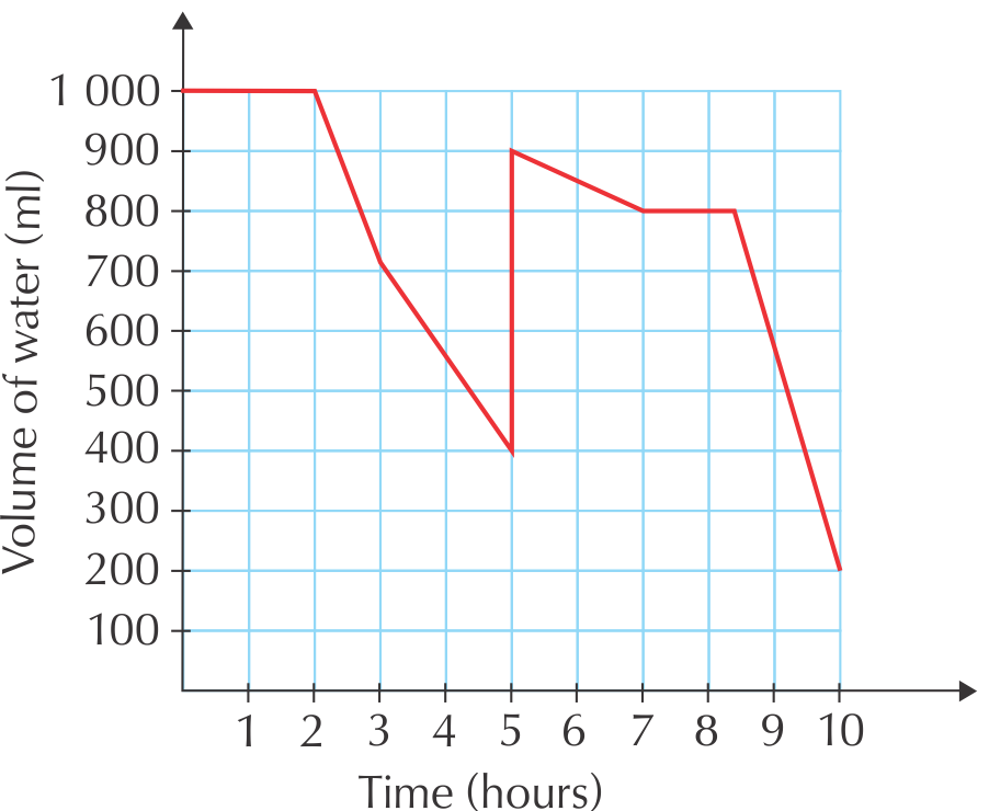Tumelo has a long day at work ahead and takes a one litre bottle of water to work with him. Look at this graph carefully and then answer the questions below.