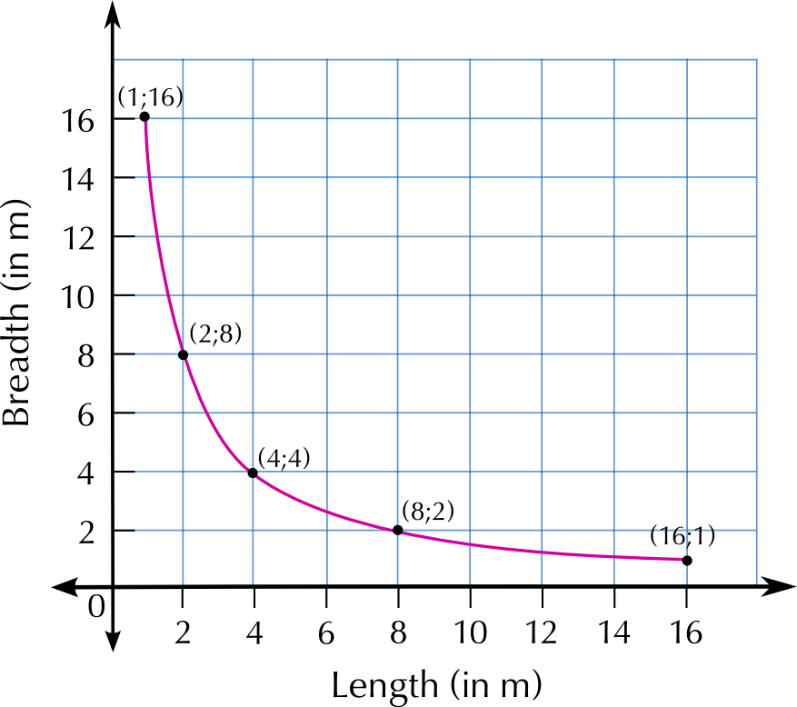 No. Any two numbers whose product is \(\text{16}\) can be used, because length and breadth are continuous variables. Whole numbers will be easier to calculate and plot on a graph, however.