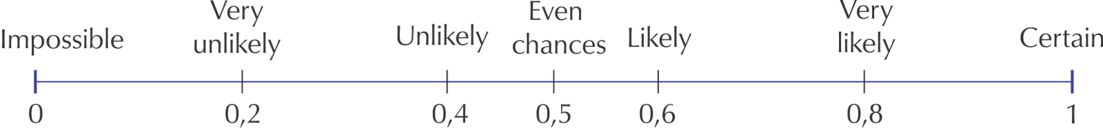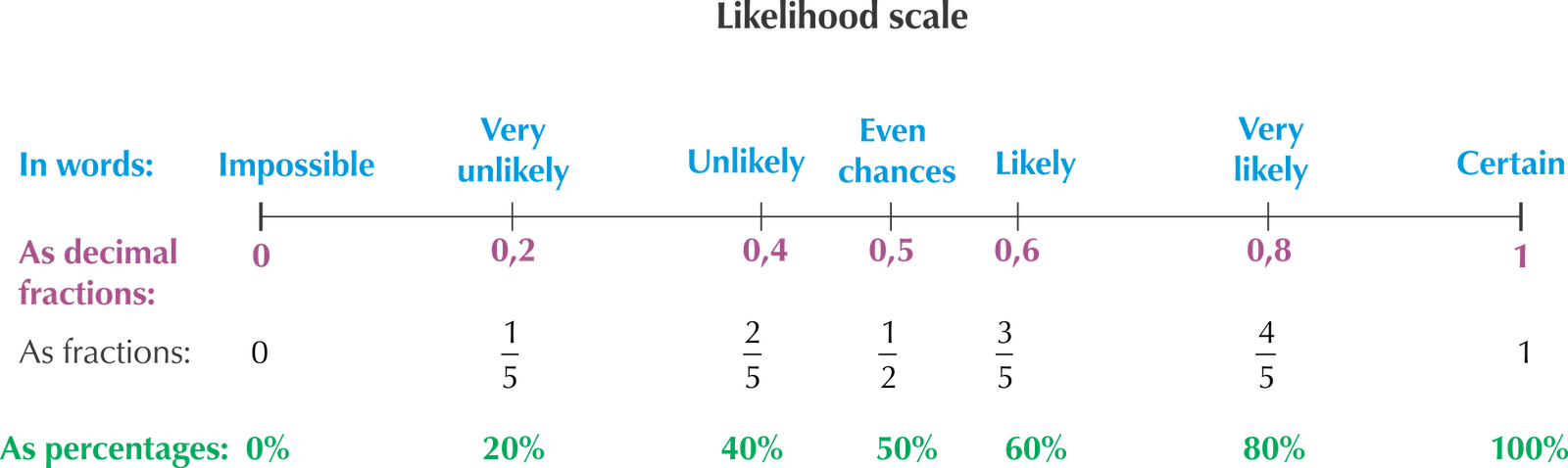 To describe the probability that something will happen we can use a probability scale. This scale is a continuous line that starts with impossible events at the left-hand end and ends with certain events at the right-hand end. All probabilities must fall somewhere on this line. An event that is described as “impossible” is one that we know will never happen, such as having 8 days in one week. An event is described as “certain” if we know that it will definitely happen, such as having a Monday in a week. Between the two ends of the line are word descriptions: very unlikely, unlikely, even chance, likely, very likely.