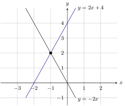 \begin{align*} y - 2x - 4 & = 0 \\ -2x - 2x - 4 & = 0 \\ -4x & = 4 \\ x & = -1 \end{align*}Substitute the value of \(x\) back into the first equation: