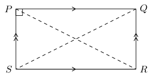 \[\begin{array}{rll} PS & = QR& \text{(opp sides of rectangle)}\\ SR & & \text{(common side)} \\ P\hat{S}R & = Q\hat{R}S = 90° & \text{ (}\angle \text{s of rectangle)}\\ \therefore \triangle PSR & \equiv \triangle QRS & \text{ (RHS)} \\ \text{Therefore } PR & = QS & \end{array}\]The diagonals of a rectangle are of equal length.