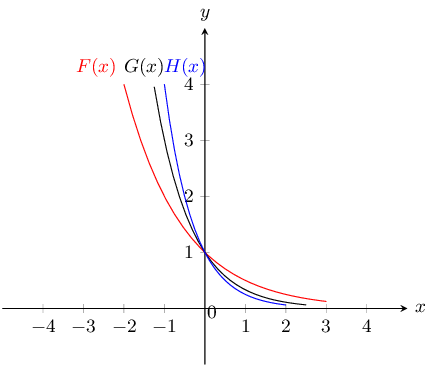 Complete the following table for each of the functions and draw the graphs on the same system of axes: \(F(x)={\left(\dfrac{1}{2}\right)}^{x}\), \(G(x)={\left(\dfrac{1}{3}\right)}^{x}\), \(H(x)={\left(\dfrac{1}{5}\right)}^{x}\)