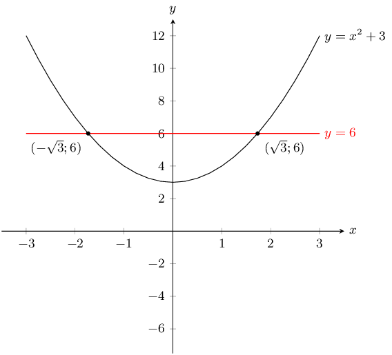 \begin{align*} x^2 + 3 &= 6 \\ x^2 - 3 &= 0 \\ (x - \sqrt{3})(x + \sqrt{3}) & = 0\\ x = \sqrt{3} &\text{ or } x = -\sqrt{3} \\ y = 6 \end{align*}The graphs intersect at \(\left(\sqrt{3};6\right)\) and \(\left(-\sqrt{3};-6\right)\).