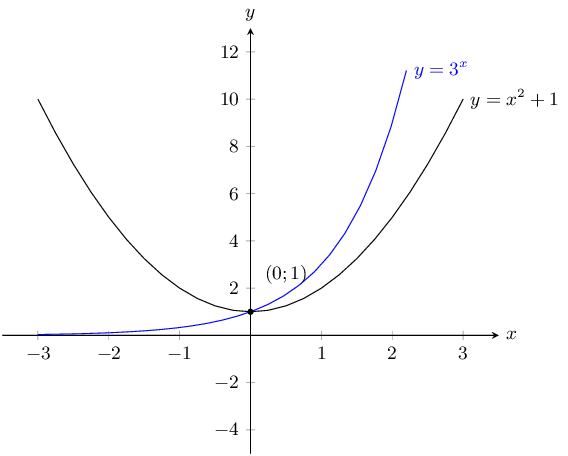 \(\begin{aligned} 0^2 + 1 & = 1 \\ 3^0 & = 1 \end{aligned}\)This is also the only point of intersection.
