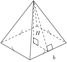 \begin{align*} h_{s}^{2} & = H^{2} + \left(\frac{b}{2}\right)^{2} \\ & = (6)^{2} + (\text{2,5})^{2} \\ h_{s} & = \sqrt{\text{42,25}} \end{align*}The surface area is: