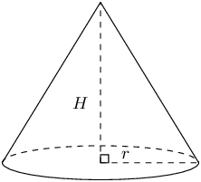 \(\begin{array}{rl} \text{Volume}& = \frac{1}{3}\times \text{area of base} \times \\ & \text{height of cone}\\ & = \frac{1}{3}\times \pi {r}^{2}\times H \end{array}\) |