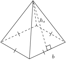\(\begin{array}{rl} \text{Surface area} & = \text{area of base } + \\ & \text{area of triangular sides} \\ & = {b}^{2} + 4\left(\frac{1}{2}b{h}_{s}\right) \\ & = b\left(b + 2{h}_{s}\right) \end{array}\) |