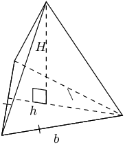 \(\begin{array}{rl} \text{Volume} & = \frac{1}{3}\times \text{area of base} \times \\ & \text{height of pyramid}\\ & = \frac{1}{3} \times \frac{1}{2}bh \times H \end{array}\) |