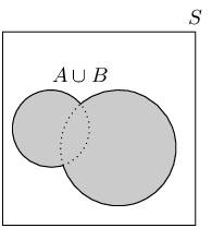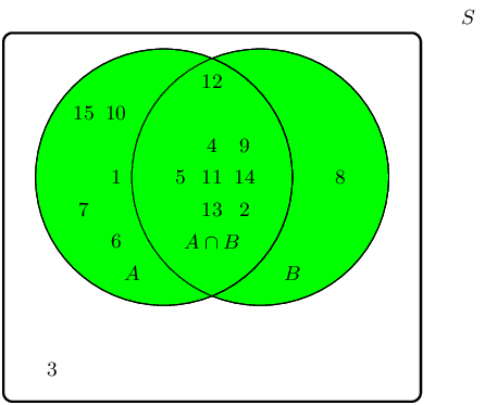 The intersection between event set \(A\) and event set \(B\), also written as \(A \cap B\), can be shaded as follows: