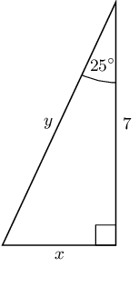 \begin{align*} x & = 7 \times \tan 25° \\ \\ y & = \frac{7}{\cos 25°} \end{align*}Use your calculator to find the answers