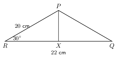 In \(\triangle PQR\), \(PR = \text{20}\text{ cm}\), \(QR = \text{22}\text{ cm}\) and \(P\hat{R}Q = 30°\). The perpendicular line from \(P\) to \(QR\) intersects \(QR\) at \(X\). Calculate: